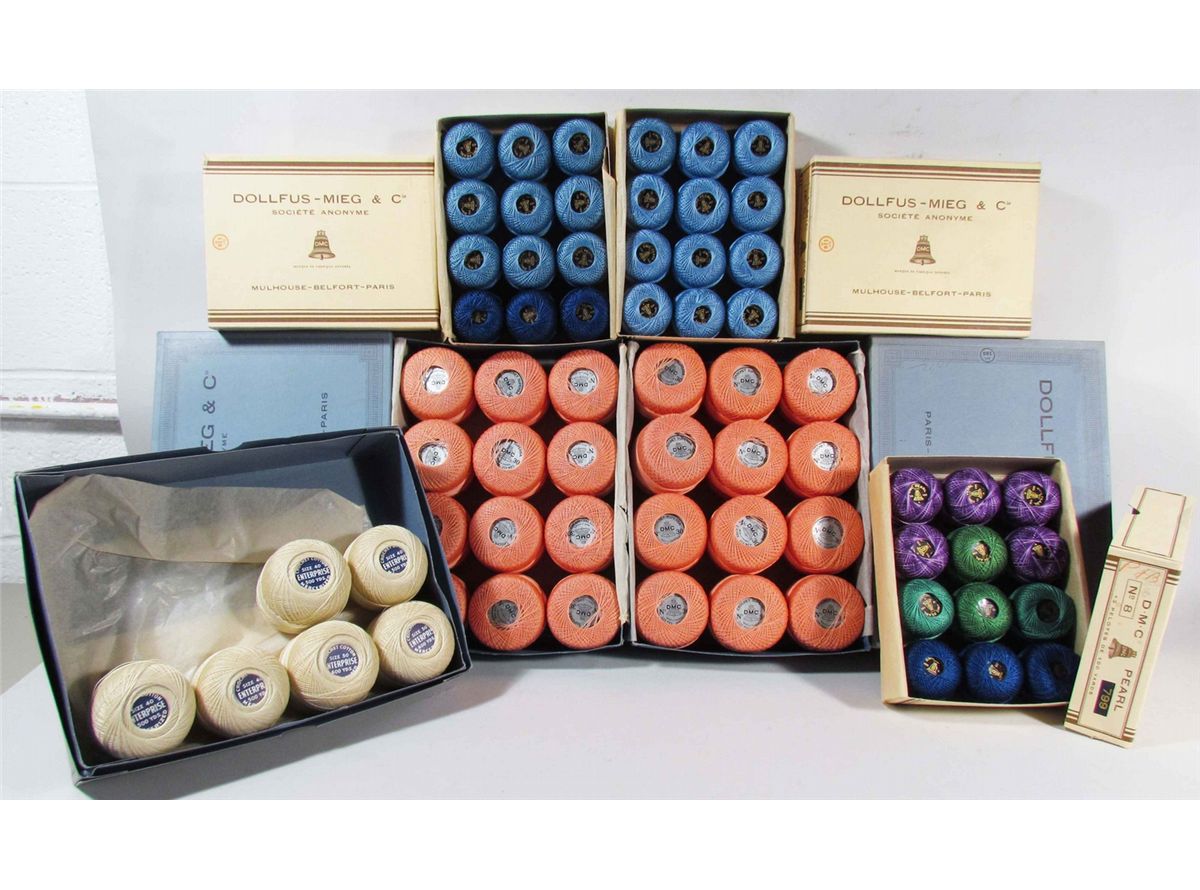 Country Store Millinery Items. 7 Boxes of Dollfus-Mieg & Co. Crochet Thread. Comes with NOS product, one box empty.