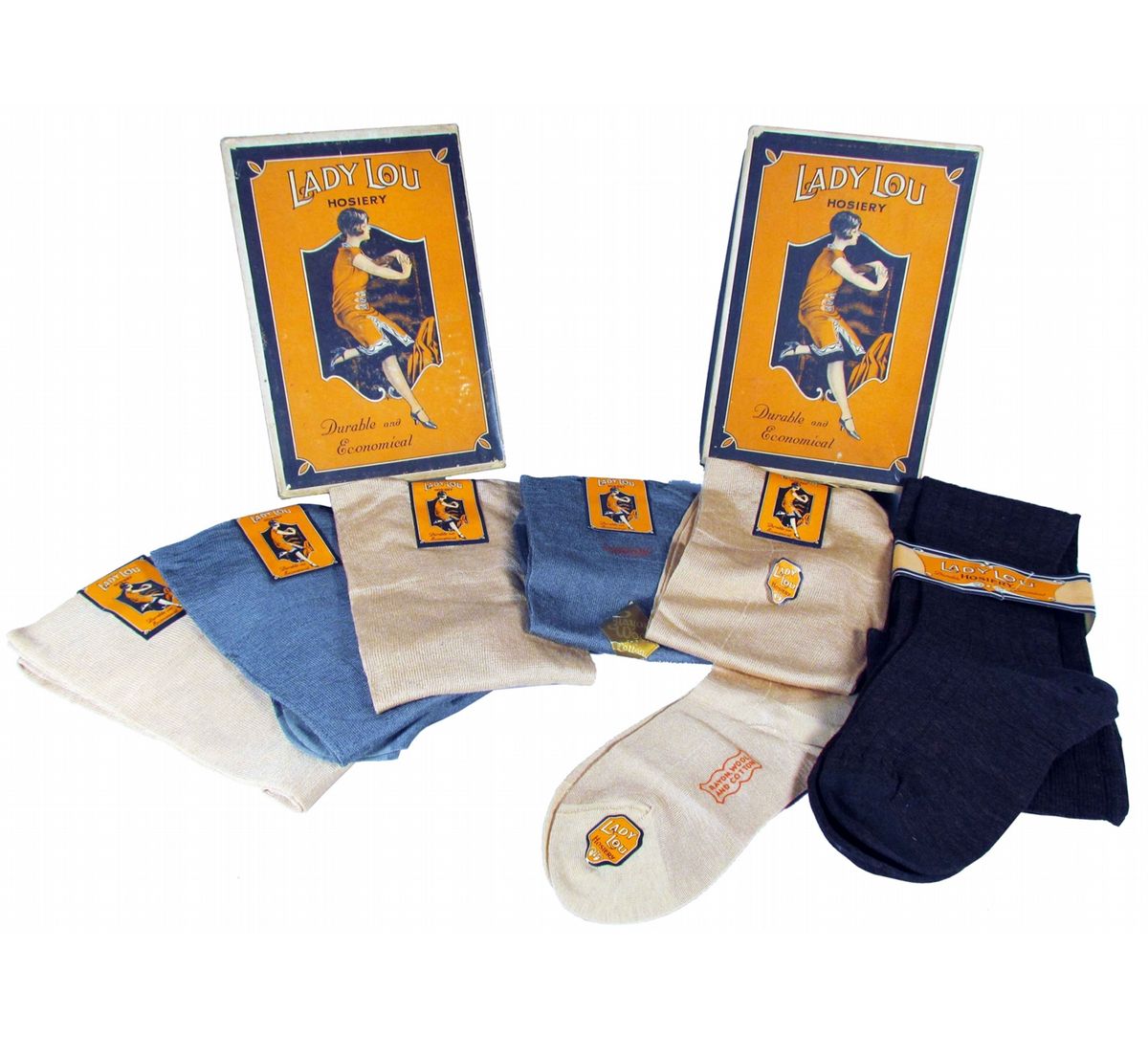 Country Store Millinery Items. Two Lady Lou Hosiery Boxes with 7 pairs of Lady Lou Hose. Boxes have some edge wear and separation otherwise excellent condition.