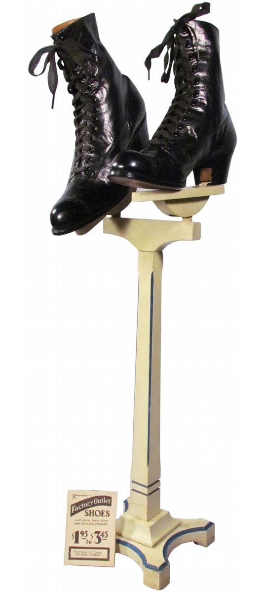 Country Store Wood Shoe Display with shoes. Comes with Shoe Store Note Pad from Charleston, SC. Display measures 23 inches tall.