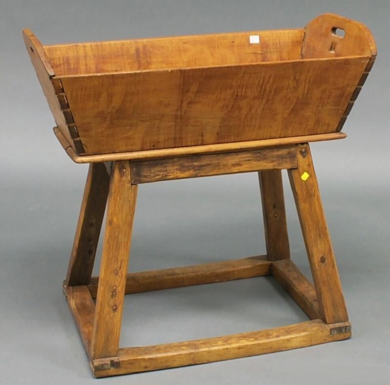 Early American (circa 1820) Country Tiger Maple Dough Box on Stand, 19th century, box with dovetailed construction and handles, set on splayed leg base, ht. 36, wd. 37, dp. 18 in.