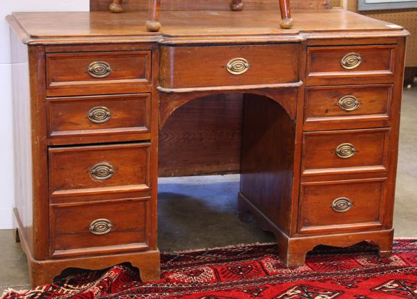 Country pine students desk circa 1840, having a breakfront kneehole flanked with two banks of graduated drawers and rising on block feet, 29.5''h x 46''w x 21''d
