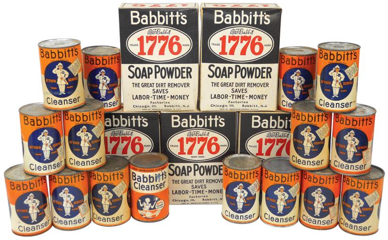 Country stock shelf stock, Babbitt's 1776 Soap Powder & Babbitt's Cleanser (25), new-old-stock full of orig product, mfgd by B.T. Babbitt & Armour & Co, most are unopened, all VG cond, 4.75" to 8.25"H.