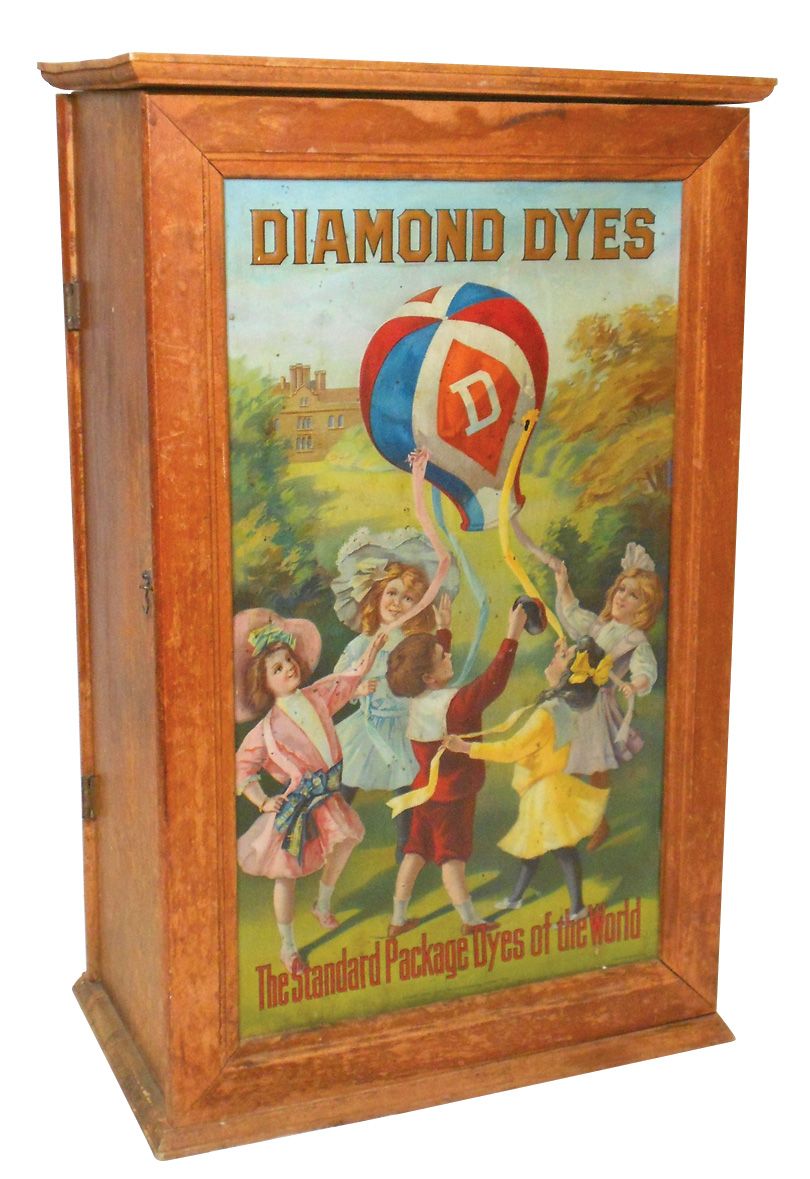 Country store Diamond Dye cabinet, "Children with the Balloon" embossed metal insert, ash case, some