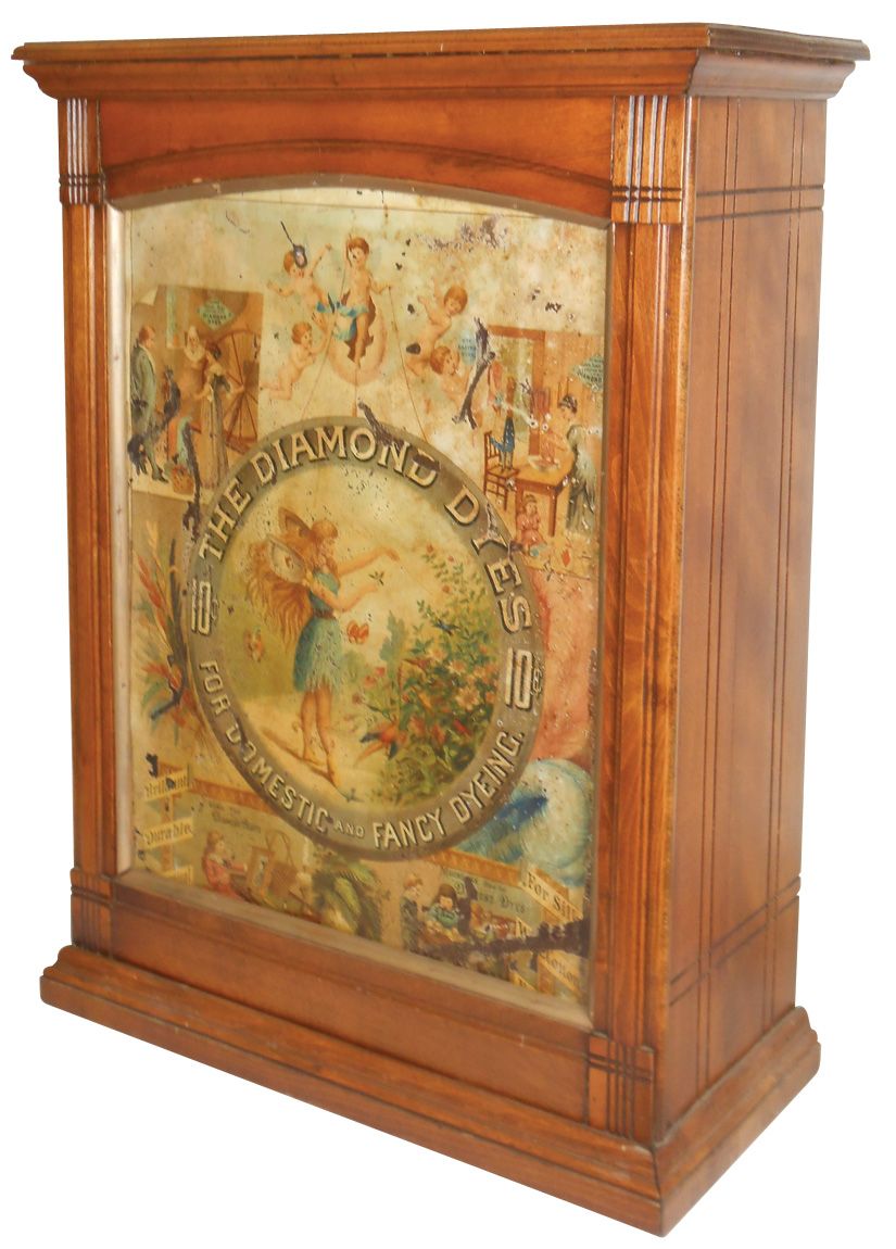 Country store Diamond Dye cabinet, Fairy w/Wand front panel, litho on embossed metal by Wells & Richardson Co., oak/ash case, adv panel Fair/Good cond, case VG cond, 30"H x 23"W x 10"D.