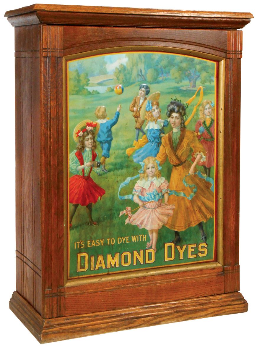 Country store Diamond Dye cabinet, "Governess" embossed tin litho front panel by Wells & Richardson Co., c.1906, oak/ash case, interior cubbyholes are complete, VG+/Exc cond w/minor pitting on litho, soft dent at upper rt & no door latch, 30"H x 22.75"W x 10"D.