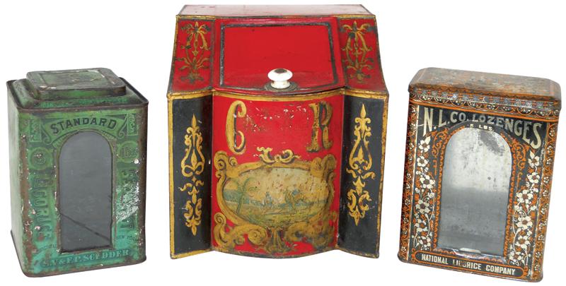 Country store Licorice Lozenges & Ginger tins (3), nice litho on tin counter displays, one S.V. & F.P. Scudder-NY dated 1884, another National Licorice Co.-Brooklyn, NY, all early 1900's in Good+ & VG cond, largest is 10"H x 9"W.
