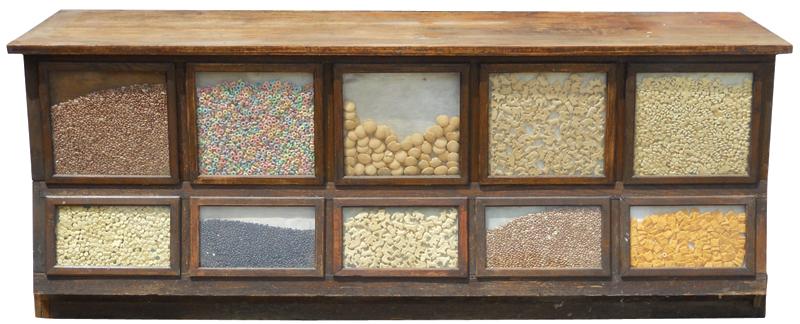 Country store Sherer Seed Cabinet, oak, 10 windows & 10 drwrs, cast iron pulls all embossed "Sherer", c.1910, VG orig cond, 34"H x 90"L x 29"D.