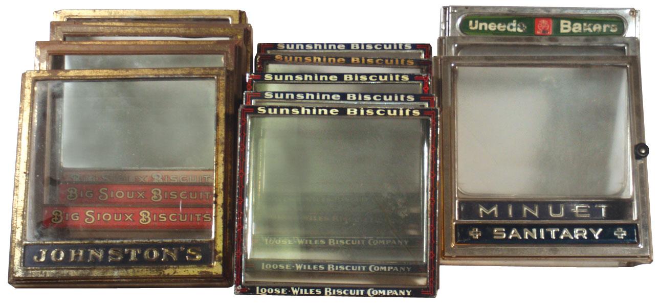 Country store biscuit box tops w/hinged lids (12), various brands, metal w/glass fronts, most in VG cond, 10.5"Sq.