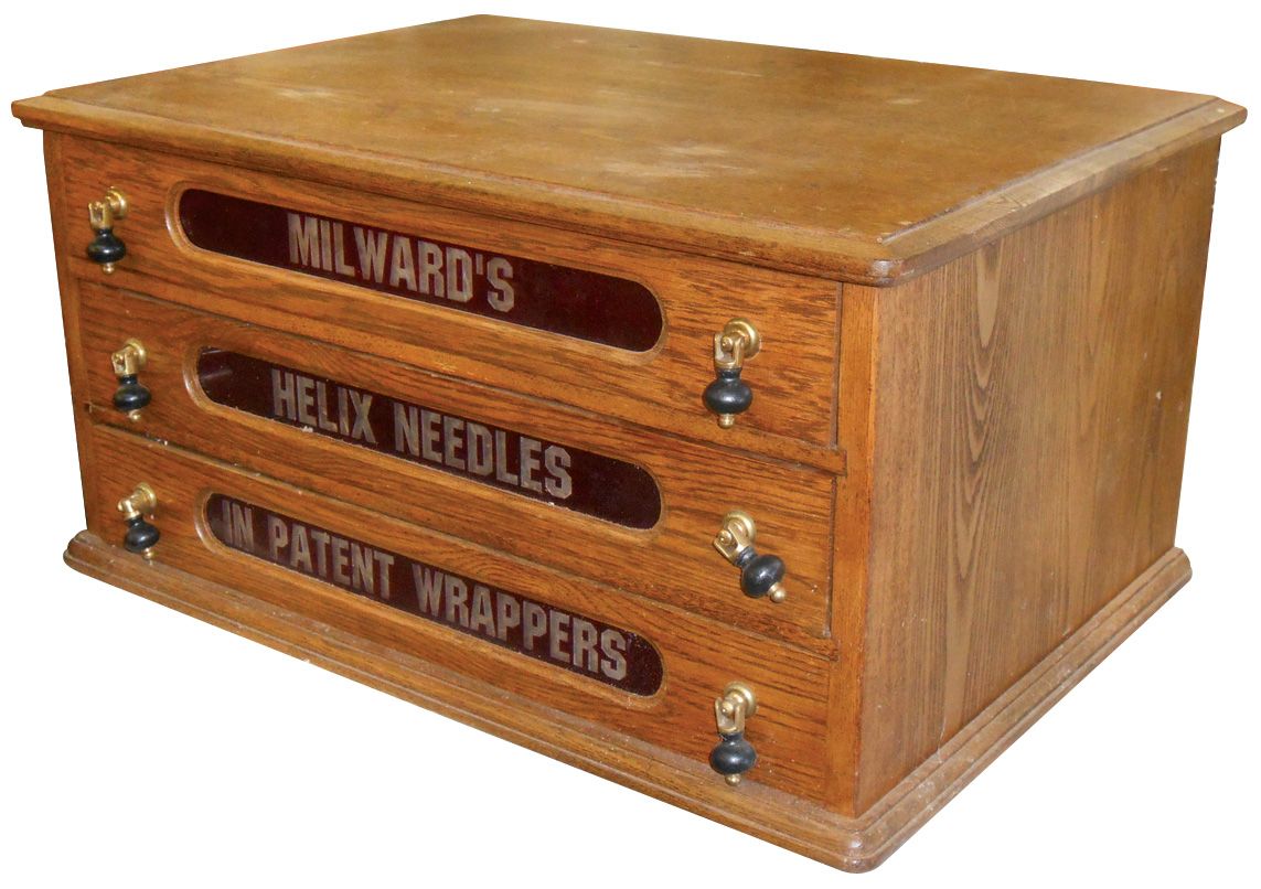 Country store cabinet, Milward's Helix Needles In Patent Wrappers, 3-drwr oak case w/teardrop pulls,