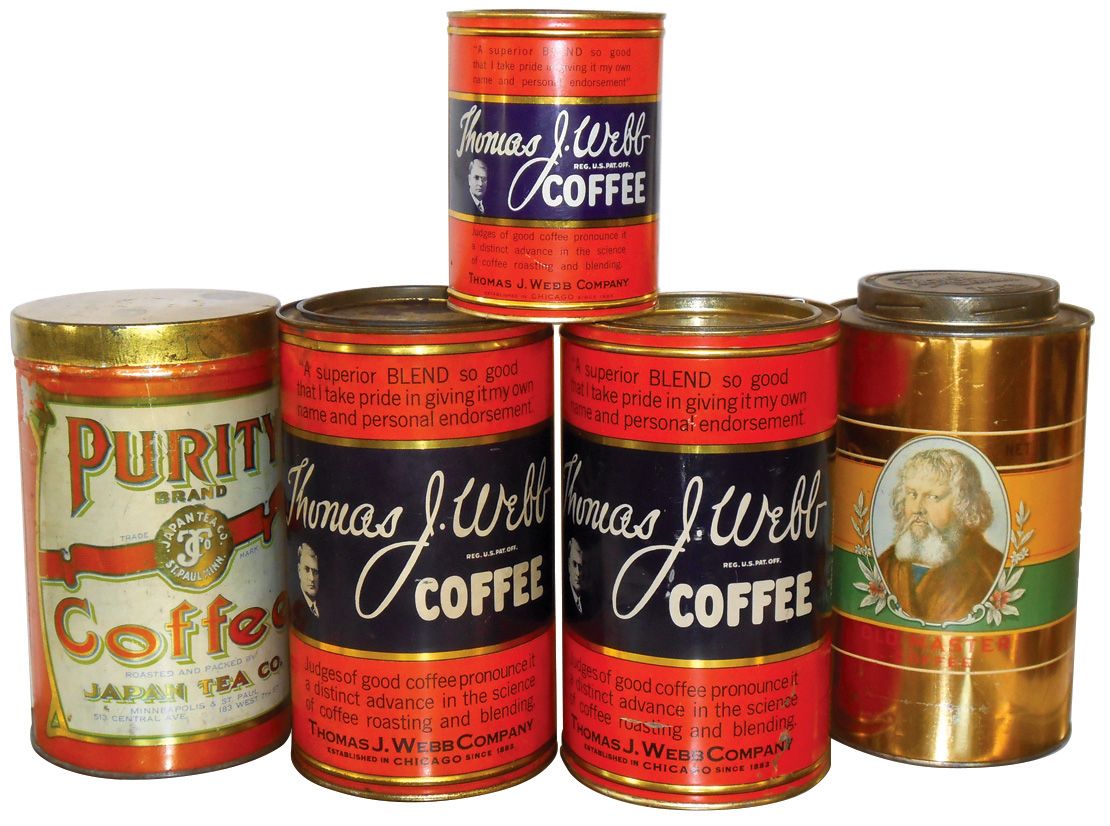 Country store coffee tins (5), Thomas J. Webb 1# & (2) 3#, Purity & Old Master 3#, Old Master 3# has "We Recommend Royal Garden Tea" lid, all VG/Exc cond, 5.5" to 10"H.
