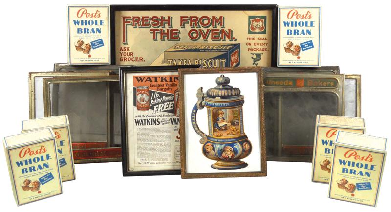 Country store items (15), Rice-Hayward Biscuit Co framed paper sign, 6 biscuit tin lids (3 Colonial & 3 Uneeda), Forest City Baking Powder die cut, Watkins framed ad & 6 Post's Whole Bran Muffin display boxes, all in Good cond, largest sign is 11.5"H x 21.5"W.
