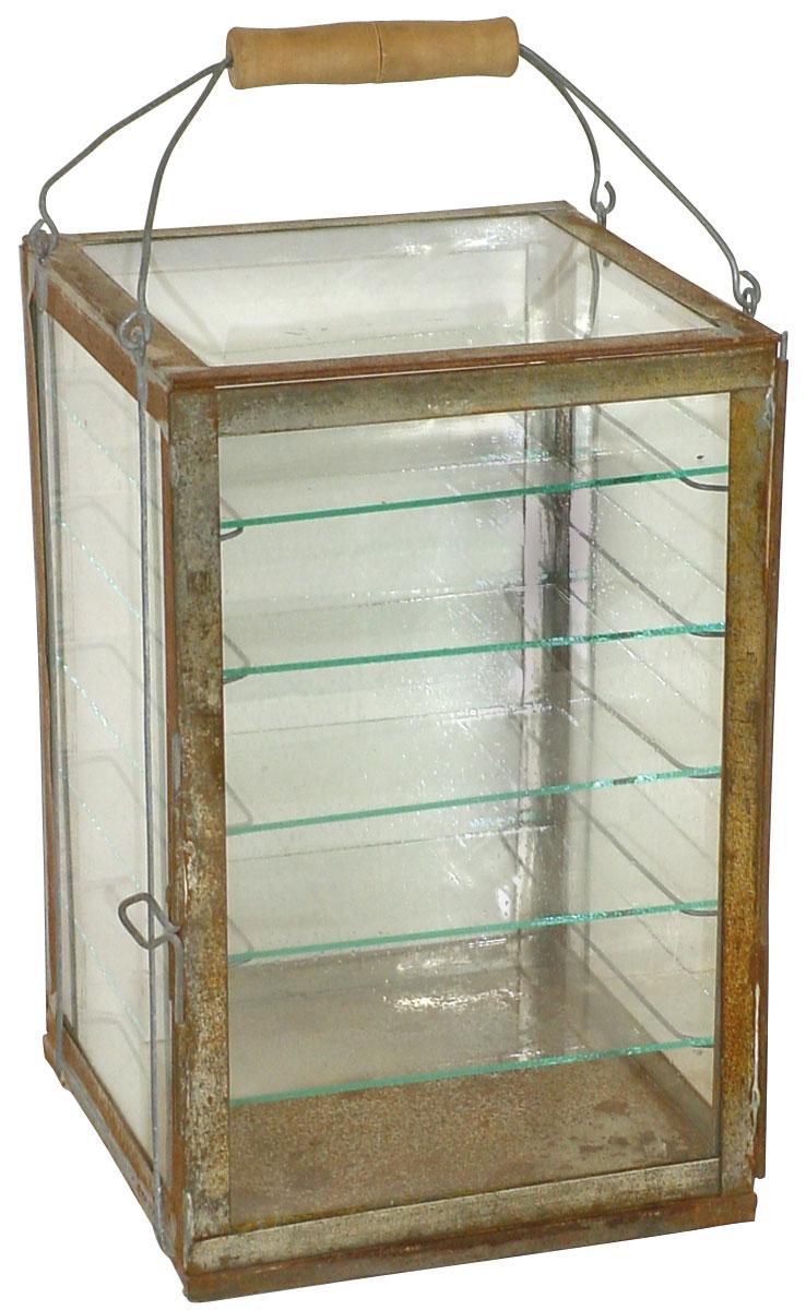 Country store pie case, glass w/metal frame & wood handle, holds 6 pies, VG cond, 17"H x 8"W x 8"D.