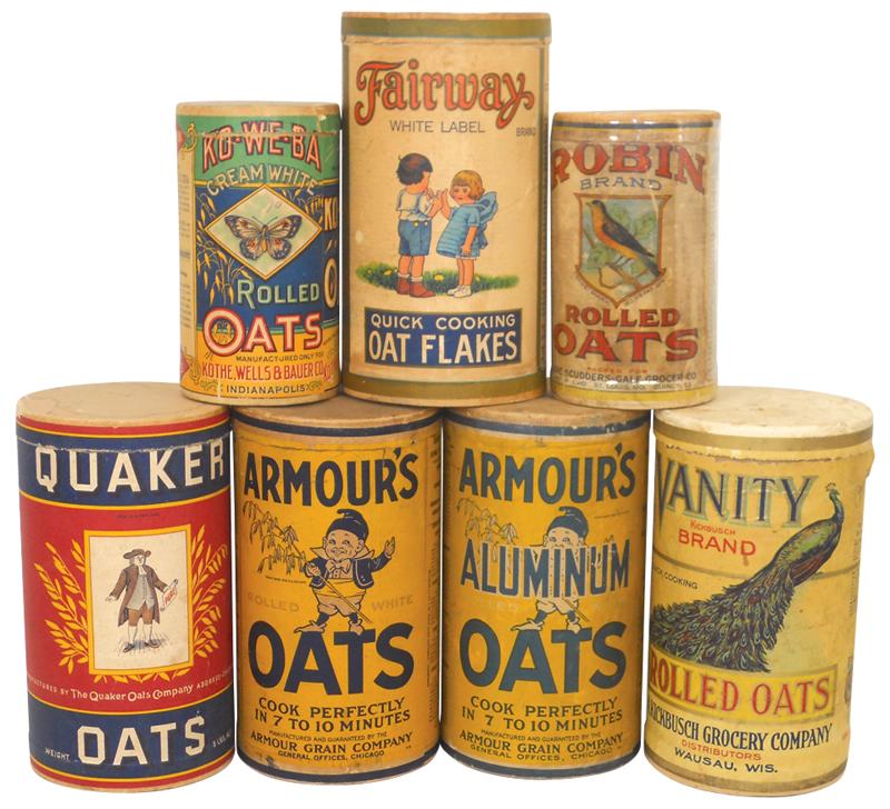 Country store rolled oats containers (7), includes Fairway, Vanity, Quaker, Armour's White & Armour'