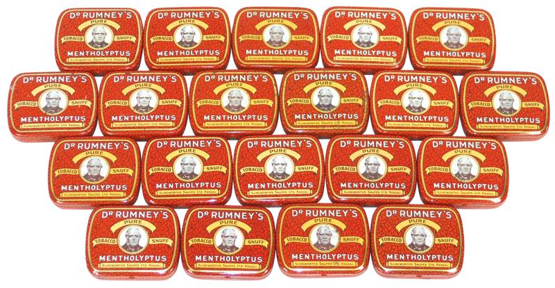 Country store shelf stock, Dr. Rumney's Snuff tins (20), all new-old-stock colorful tins in Exc cond, ea 2"H x 2.5"W.