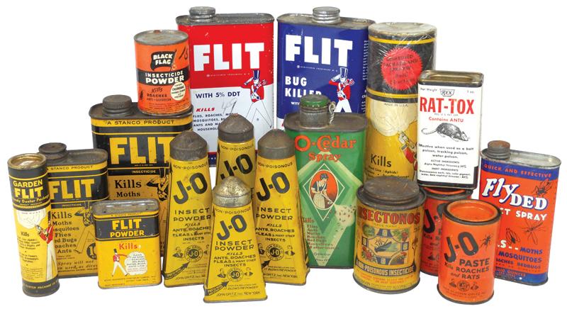 Country store shelf stock, pesticides, includes J-O, Flit by Esso Std. Oil Co., O-Cedar, Rat-Tox, Fly Ded, Black Flag, Insectonos, etc., some metal, some cdbd w/paper labels, Good to Exc cond, 2.75" to 9"H.
