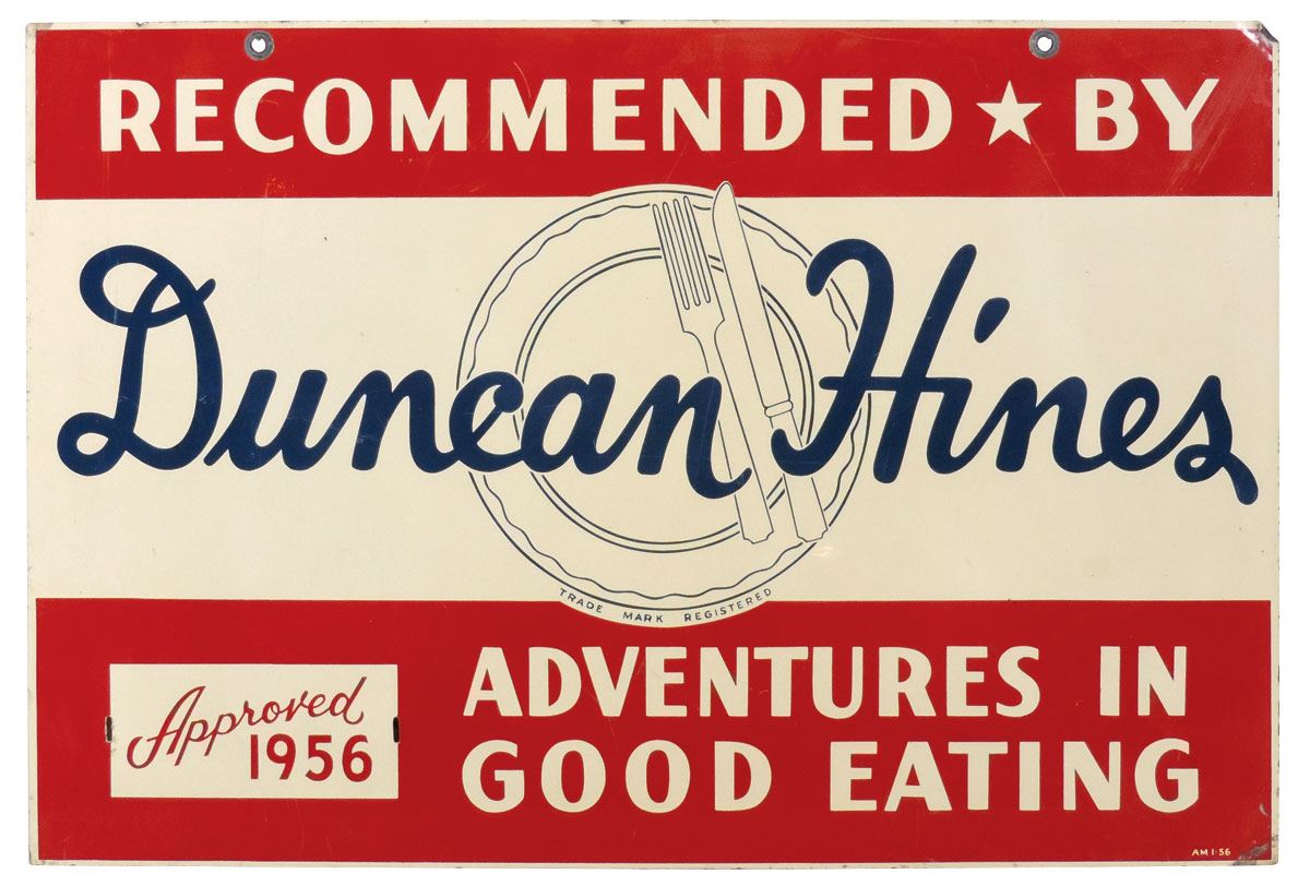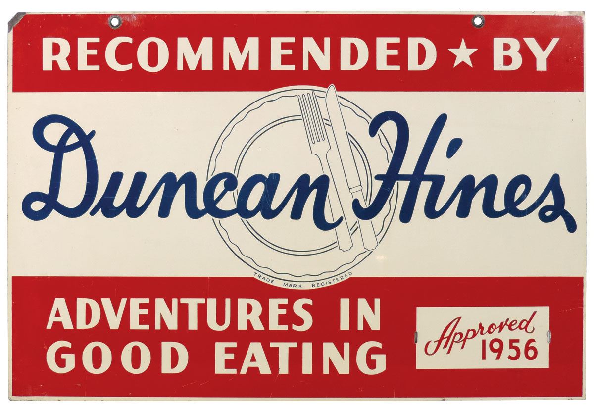 Country store sign, Duncan Hines-Adventures in Good Eating, 2-sided heavy metal sign mfgd by AM Sign Co., c.1950's, red, white & blue, VG/Exc cond, 16"H x 24"W.