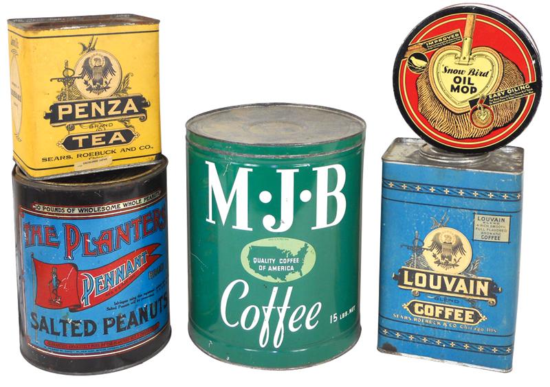 Country store tins (5), Planters Peanuts, MJB Coffee, Penza Tea & Louvain Coffee (both by Sears Roebuck) & Snow Bird Oil Mop, all large size tins in Good & VG cond, 4" to 12"H.