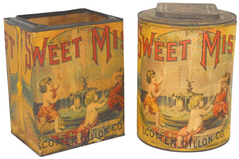 Country store tobacco tins (2), both Sweet Mist mfgd by Scotten, Dillon Co.-Detroit, Mich, large rou