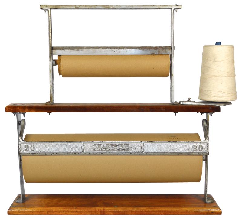 Country store wrapping paper rack, "Columbia" double rack w/string holder, wood & metal, Exc cond, 24"H x 26"W.