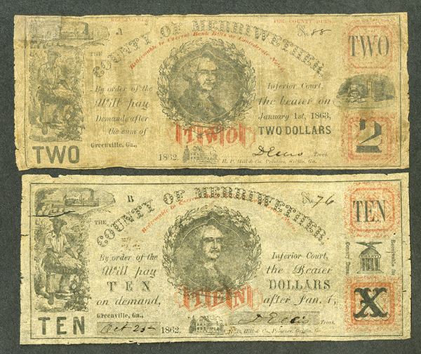Greenville, GA. æ$2 and $10, 1862 dated notes. Washington in middle flanked by attractive red and black county issue printed on fragile tissue-like paper. The $2 grading Fine with small repairs and the $10 in exceptional condition and possibly grade XF to AU with splits in the thin paper.