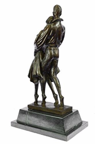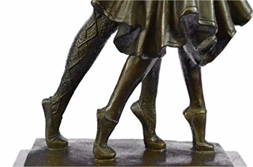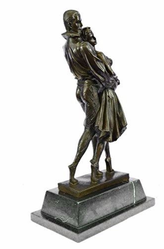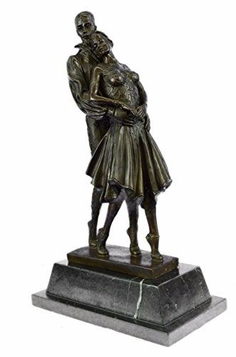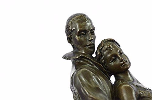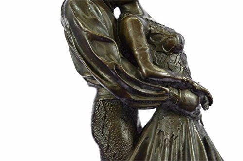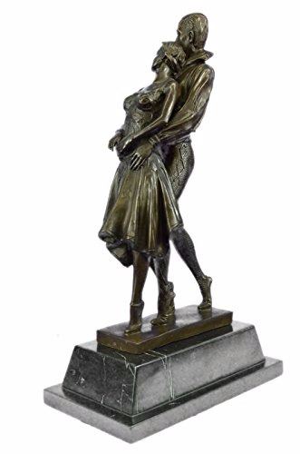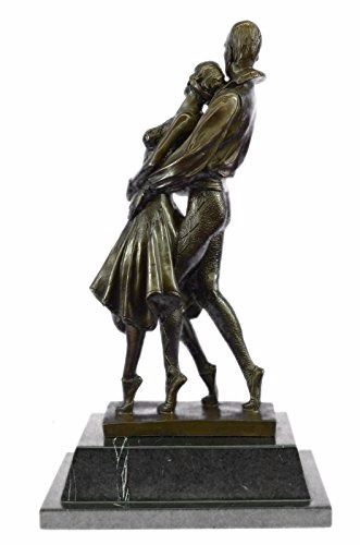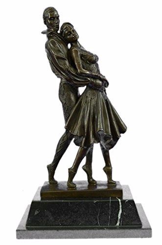 This gorgeous piece of a couple dancing in unison is to die for. Her detailed dress shirt is more then the eye can handle, it is designed to leave you stunned with its amazing tangled and connected circular lines. Her skirt is right under her knee cap and tie around the ankle high heels compliment it with a elegance. He is wearing tights with a suit jacket that comes with a puff to the sleeves. She rests her head on his chest while he grabs her waist with his strongly hands she hold on to them ready to take the swing turn. They was captured using the age-old method of lost-wax casting and stained with a brown patina for preservation. The bronze sculpture is mounted upon a black marble base. Bronze Dimensions with Marble Base: Height 18 X Width 10 inches. Weight: 20 LBS.
