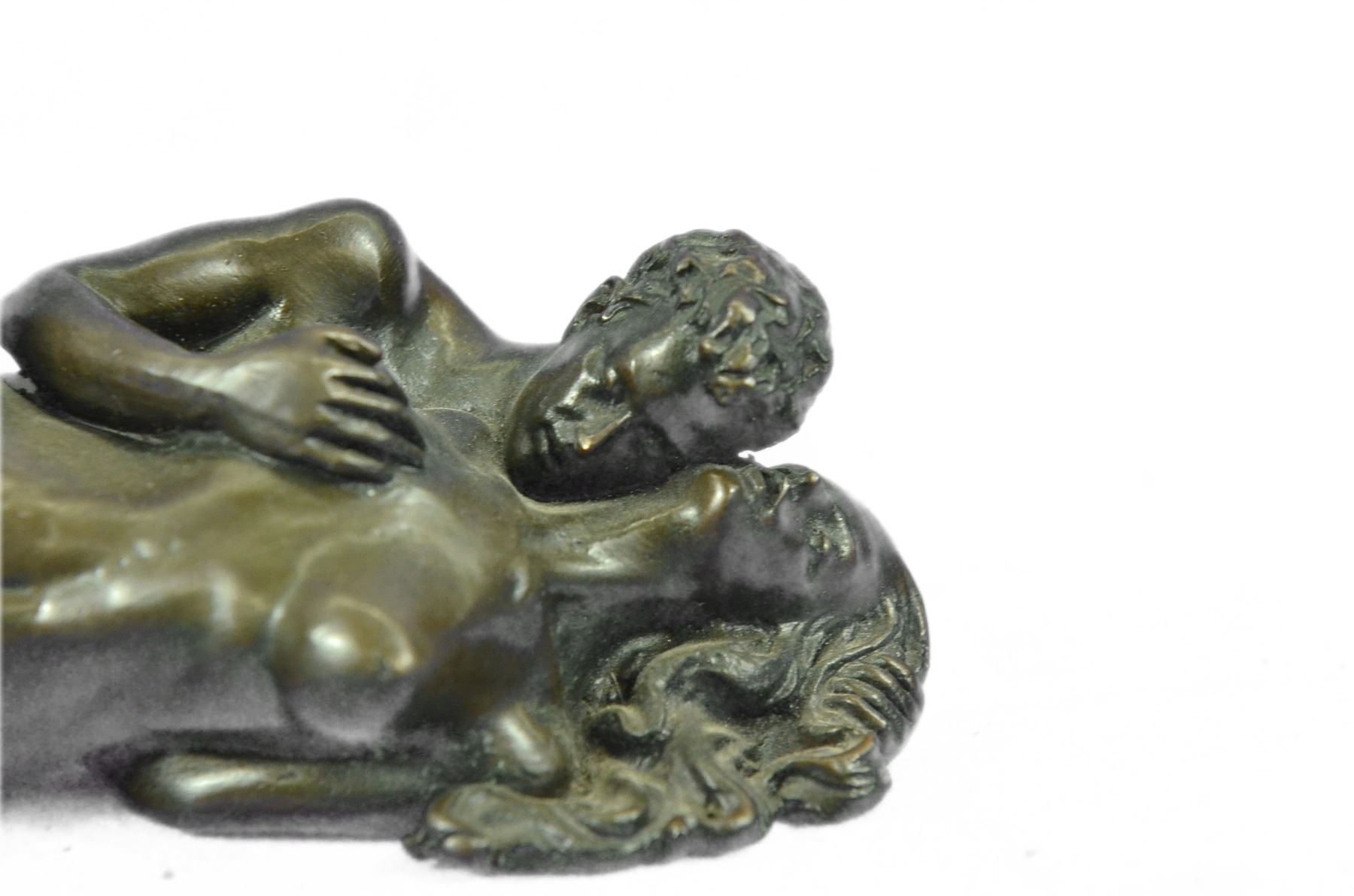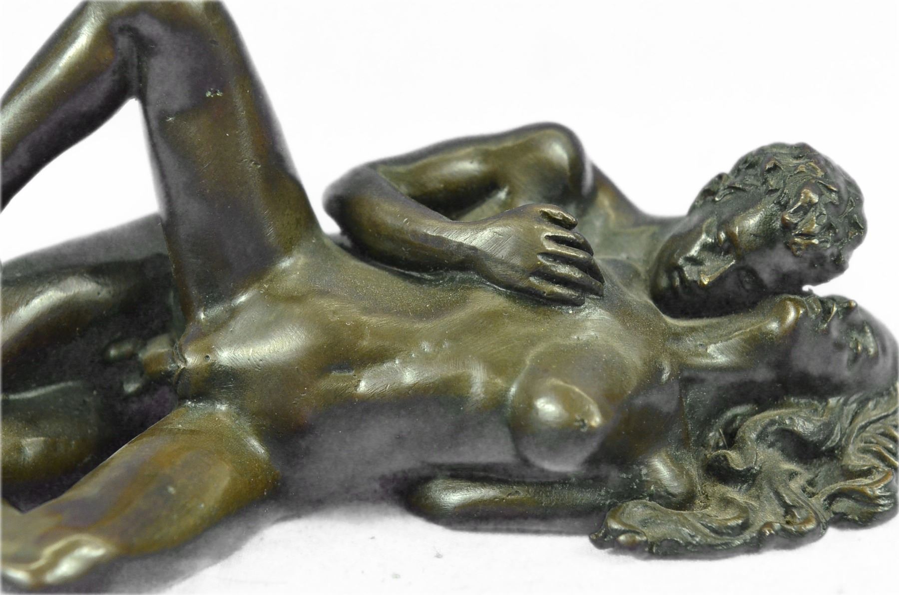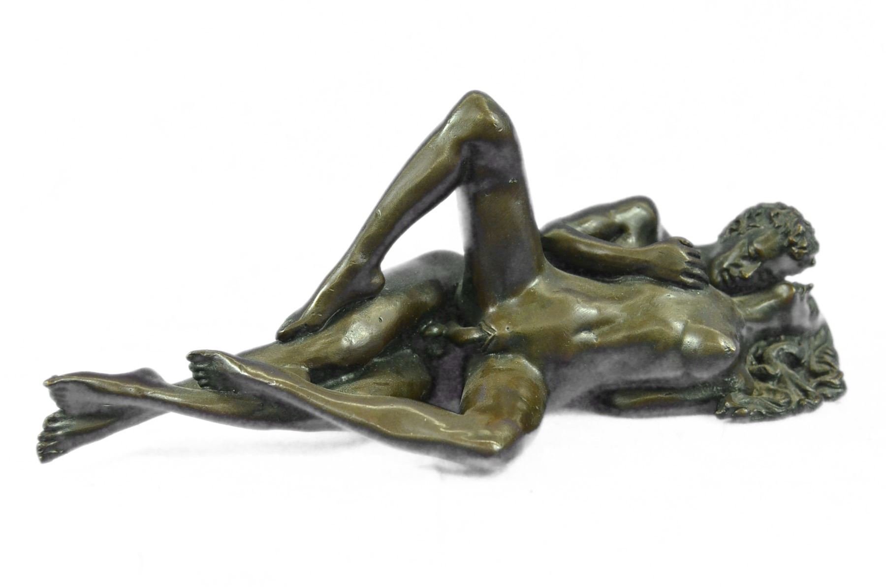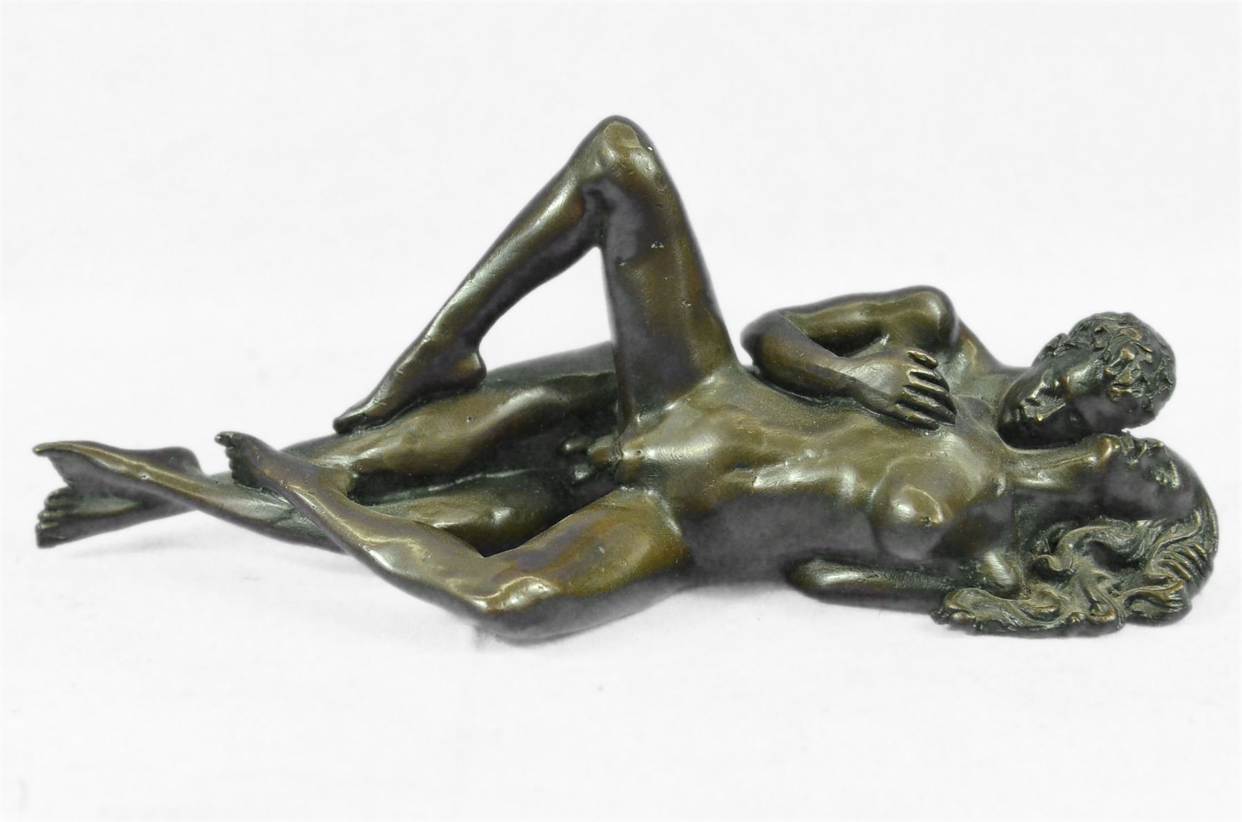 This highly erotic figurine features a male and female in a very evocative pose. The femaleand male lay on there side as if they were spoonign, while the man penetrates her from behind. He rests his hands on her breast while she places both arms behind her.Judging by their facial expressions, one can readily see that they are enjoying their activity. This piece is definitely a great conversation starter and would make a great gift for yourself or for someone who likes to be amused or appreciates nude sculptures. Despite its subject matter, this bronze sculpture is still a masterful and fine detailed execution, cast using the lost wax method, ensuring a highly detailed work of art that will be a treasure for years to come. The handmade bronze sculpture was cast using the archaic method of lost-wax casting and stained with a brown patina finish for perpetuation. Bronze Dimensions: Height 4 X Width 8 inches. Weight: 4 LBS. Inventory: 35ST0233853