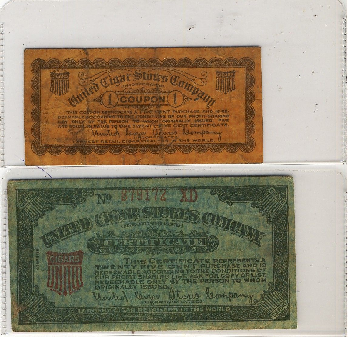 Coupons; United Cigar Stores Company Coupon & Certificate, both representing the purchase 5 Cent & 25 Cent respectively. Could be redeemed for various items like furniture, clothes, toys, even guns and shotguns and lots more. Probably dates early 1900's.