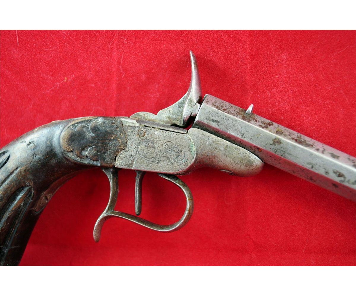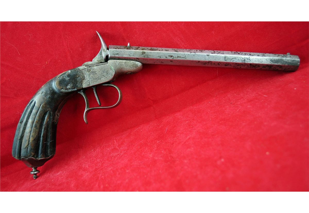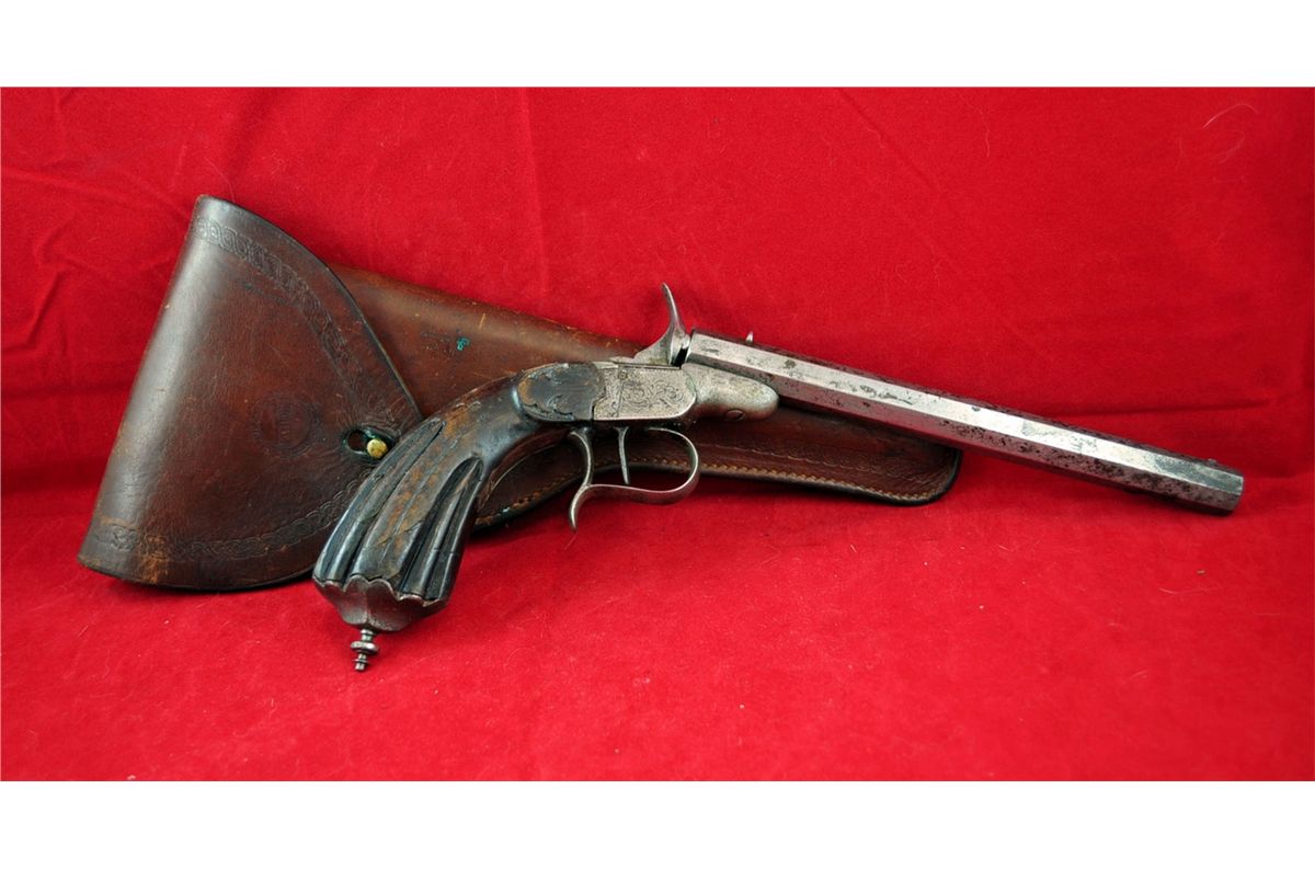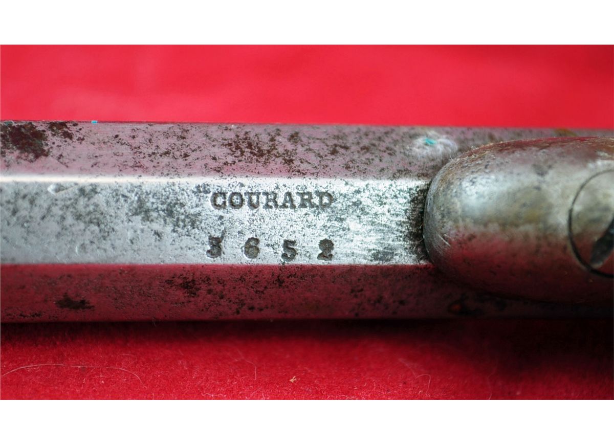 Courard (Belgium) Single Shot Salon Pistol, 7.75" Bbl., Ser.#5652, Engraved Steel W/ Carved, French style vertical ribbing on butt. Brown Leather Holster.COURARD, Mfg. by Courard Hubert, Joseph , manufacturer of weapons, Argenteau (1864 - 1871) LIEGE (1865). See photos for more information. Gun is being sold for decorative and collector purposes NOT for firing. See photos for more information.Kennedys Auction Service has not attempted to test fire any gun in this auction and all guns are sold "IN AS IS CONDITION" and are not guaranteed to be operational.