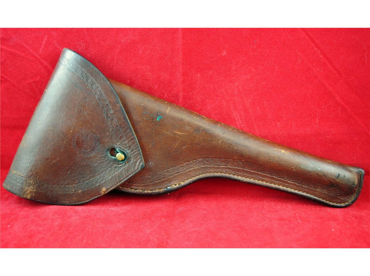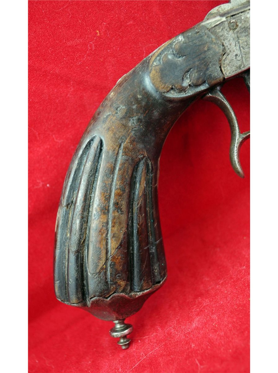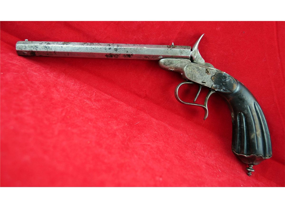 Courard (Belgium) Single Shot Salon Pistol, 7.75" Bbl., Ser.#5652, Engraved Steel W/ Carved, French style vertical ribbing on butt. Brown Leather Holster.COURARD, Mfg. by Courard Hubert, Joseph , manufacturer of weapons, Argenteau (1864 - 1871) LIEGE (1865). See photos for more information. Gun is being sold for decorative and collector purposes NOT for firing. See photos for more information.Kennedys Auction Service has not attempted to test fire any gun in this auction and all guns are sold "IN AS IS CONDITION" and are not guaranteed to be operational.