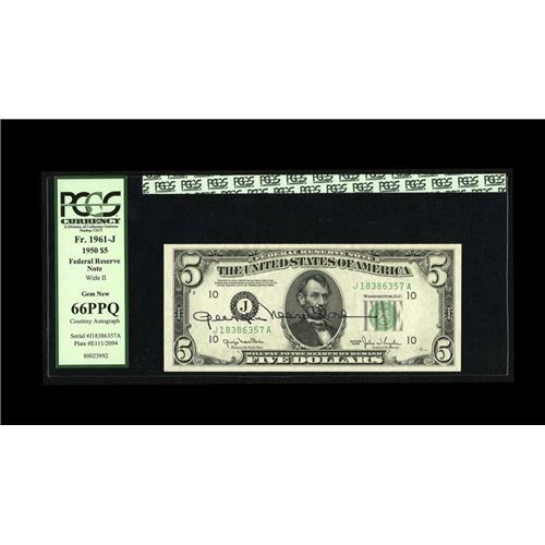 <B>Courtesy Autograph Fr. 1961-J $5 1950 Wide II Federal Reserve Note. PCGS Gem New 66PPQ.</B></I><BR>This Wide II example with broad margins displays back plate number 2094. It has been graciously hand-signed by Georgia Neese Clark, first woman Treasurer of the United States.<BR><BR><b>Shipping:</b> Coin/Currency (<a target="_blank" href="http://www.heritageauctions.com/common/shipping.php">view shipping information</a>)