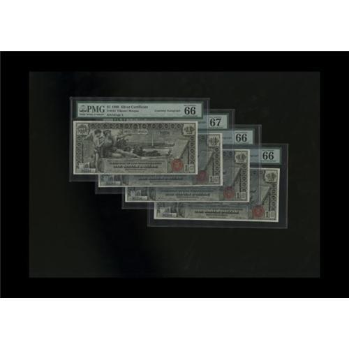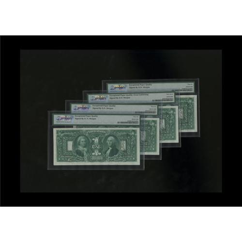 <B>Courtesy Autograph Fr. 224 $1 1896 Silver Certificate Cut Sheet PMG Gem Uncirculated 66 EPQ; 67 EPQ; 66 EPQ; 66 EPQ.</B></I> This stunning third-party graded cut sheet has the autograph of Treasurer D.N. Morgan on the back of each note. Mr. Morgan also added "Treasurer 1893 - 1897" underneath each of his signatures on these notes that also exhibit his engraved signature on the face. The notes carry serial numbers 633-36 and each is fully margined and carries a grade of 66 or better. The three 66 notes have the additional PMG comments of "great embossing," while the 67 note's comments are "exceptional paper quality, great embossing." Also, this cut sheet shows that there was not much room between the notes and that the cutting blades had to be "right on the money" in order to get the desired results of nicely margined notes that paper money collectors cherish. A fantastic paper money item that combines condition, rarity, and history.