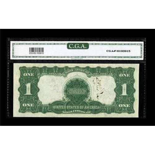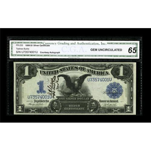 <B>Courtesy Autograph Fr. 233 $1 1899 Silver Certificate CGA Gem Uncirculated 65.</B></I><BR> This plate letter A note is autographed by the <B>Dep'y Asst. Treas. U.S. New York</B></I>. If anybody knows this signature that has had the numismatic community befuddled all of these years, please inform us.<BR><BR><b>Shipping:</b> Coins & Currency (<a target="_blank" href="http://www.heritageauctions.com/common/shipping.php">view shipping information</a>)