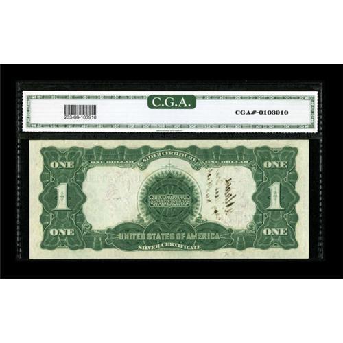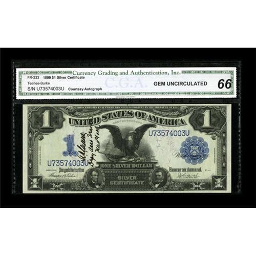 <B>Courtesy Autograph Fr. 233 $1 1899 Silver Certificate CGA Gem Uncirculated 66.</B></I><BR> This plate letter C Black Eagle is autographed by the <B>Dep'y Asst. Treas. U.S. New York </B></I>with the unreadable name. There are only four notes in the large size census with this autograph and all four of those notes are in this auction. <BR><BR><b>Shipping:</b> Coins & Currency (<a target="_blank" href="http://www.heritageauctions.com/common/shipping.php">view shipping information</a>)