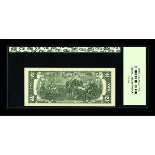 <B>Courtesy Autographed Fr. 1936-F* $2 1995 Federal Reserve Note. PCGS Superb Gem New 69PPQ.</B></I><BR>Treasurer Mary Ellen Withrow signed this near-perfect note above her signature.<BR><BR><b>Shipping:</b> Coins & Currency (<a target="_blank" href="http://www.heritageauctions.com/common/shipping.php">view shipping information</a>)