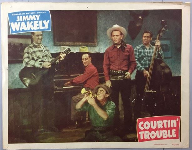 Courtin' Trouble (Monogram Pictures, 1948). Lobby Card. This is a rare movie theater lobby card. Starring: Jimmy Wakely. There are marks, pin holes and edge wear. Fine. (11" X 14").