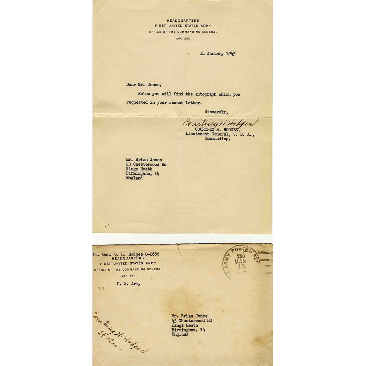 World War II General Courtney H. Hodges 1945 Typed Letter Signed and Envelope -- Very Good Condition