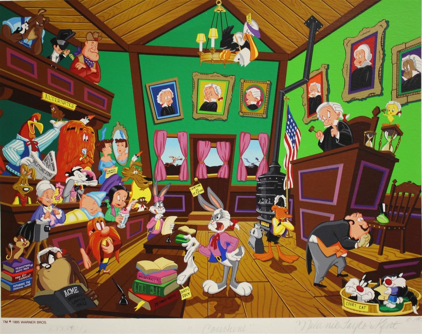 Melanie T. Kent illustrates the Hanna Barbera collection of characters in a courtroom cartoon setting. This unframed limited edition giclee #LXXXV/CV measures approx. 12 x 16.