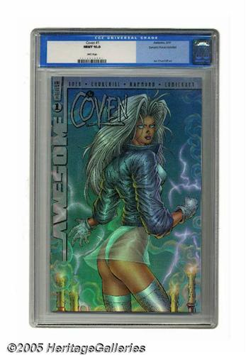 <B>Coven #1 (Awesome Entertainment, 1997) CGC MT 10.0 White pages.</B></I> Gem Mint copy. Dynamic Forces Holofoil edition. Ian Churchill art. Overstreet 2005 NM- 9.2 value = $8. CGC census 1/05 (for the Dynamic Forces Holofoil edition): 3 in 10.0. <I>From the collection of Chris Bell.</B></I>