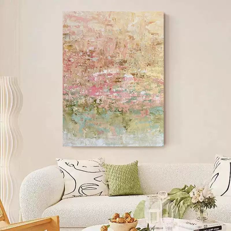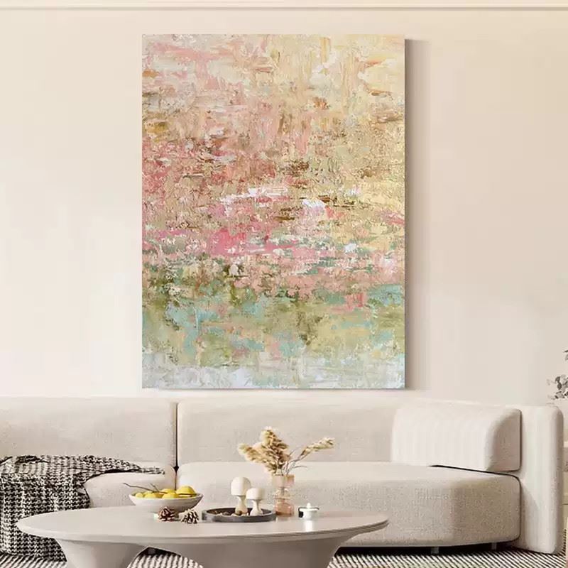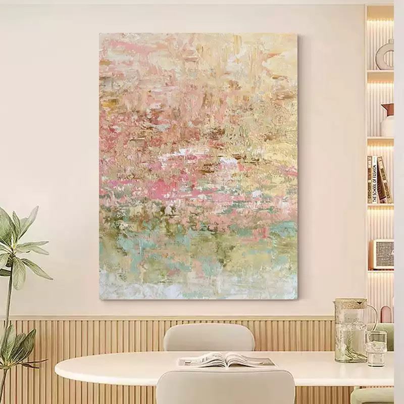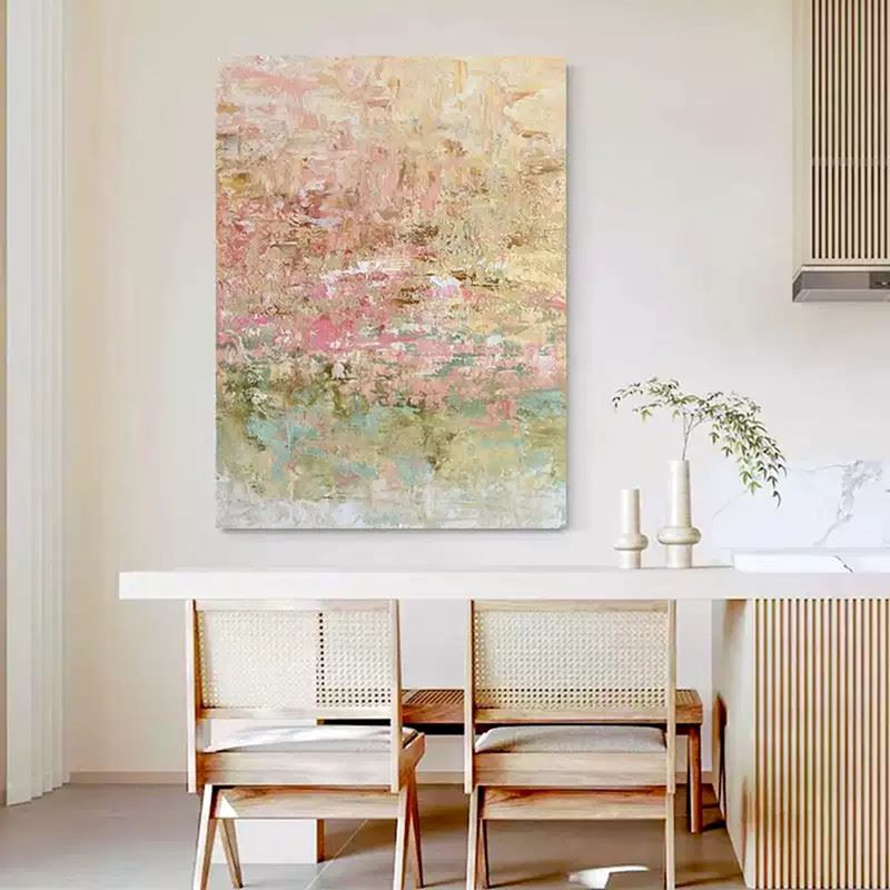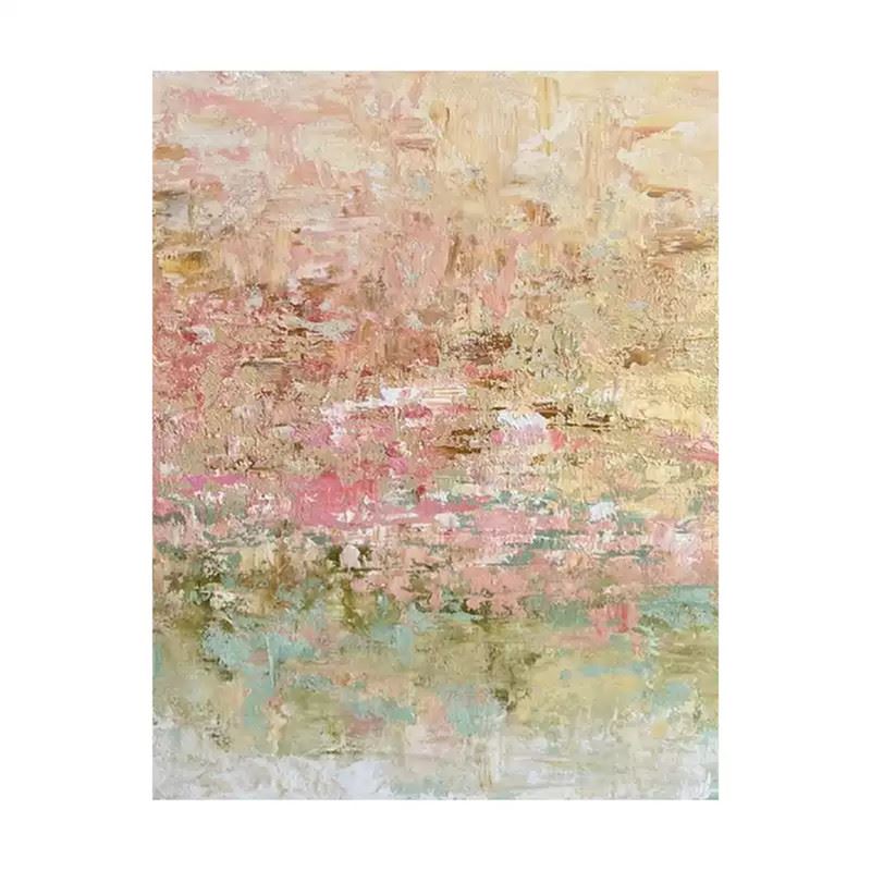 This artwork uses warm tones and textured brushstrokes to depict the tranquility and harmony of nature. The intertwining pinks, golds, and soft greens evoke a sense of belonging and rest, offering a serene peace for the soul. Dimensions: 24 x 31 inches.