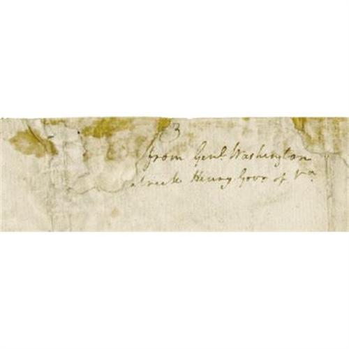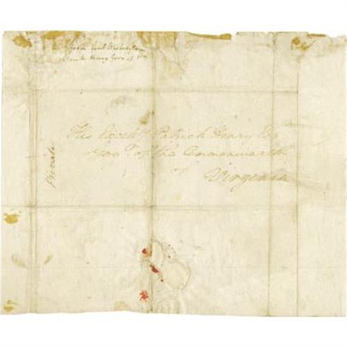 <B>Cover Addressed by George Washington to Patriot Patrick Henry</B></I> Fantastic association linking great Revolutionary War Patriots <B>George Washington</B></I> and <B>Patrick Henry</B></I> in the form of an address cover engrossed by Washington. In full: "<I>His Excelly Patrick Henry Esg / Gov r of the Commonwealth of Virginia</B></I>" in large letters. The cover is labeled "<I>Private</B></I>" in another hand, perpendicularly along the left margin. The docket, which remains largely legible has some paper loss which has been reinforced, caused by the opening of the red wax seal. Cover has wear and some soiling, with mailing folds traversing Washington's holograph in two places. One can only imagine the content of the letter it once transmitted!<BR><BR><b>Shipping:</b> Flat Material, Small (<a target="_blank" href="http://www.heritageauctions.com/common/shipping.php">view shipping information</a>)