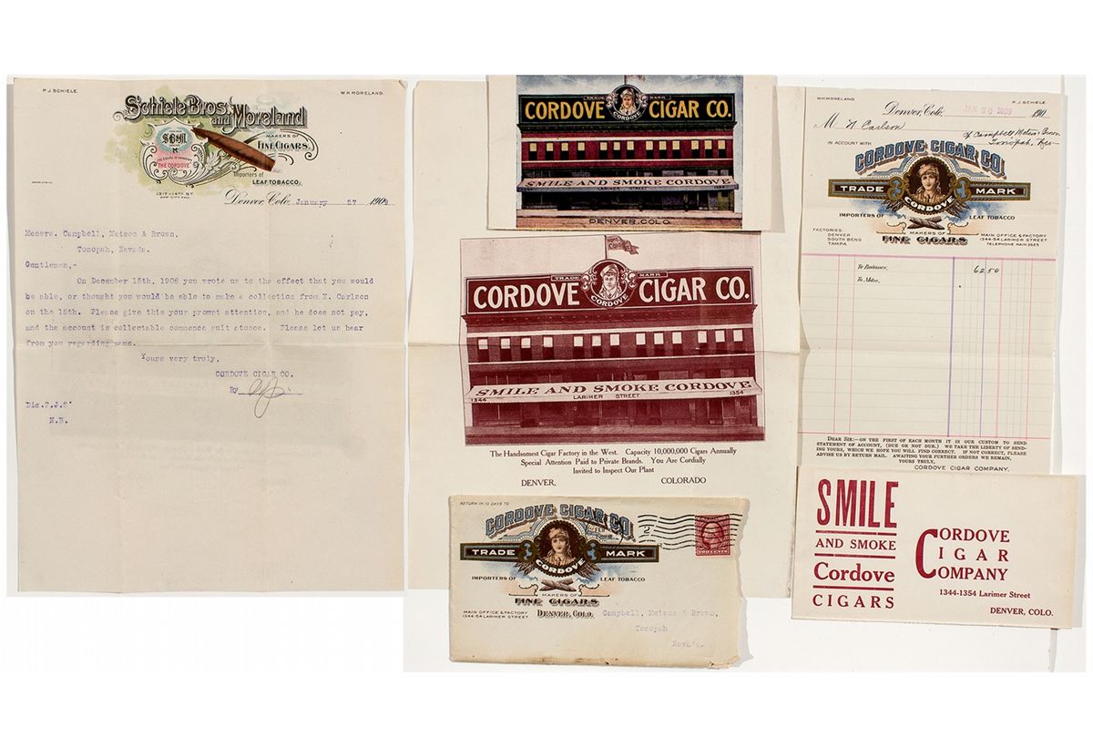 c1910 Lot of 5 pieces from Colorado. These colorful pieces include ads for, Cordove Cigar Co. and one for Schiele Bros and Moreland Fine Cigars. The pieces have very little wear and have maintained bright colors. This is a great group for any saloon collector! - HKA#66235