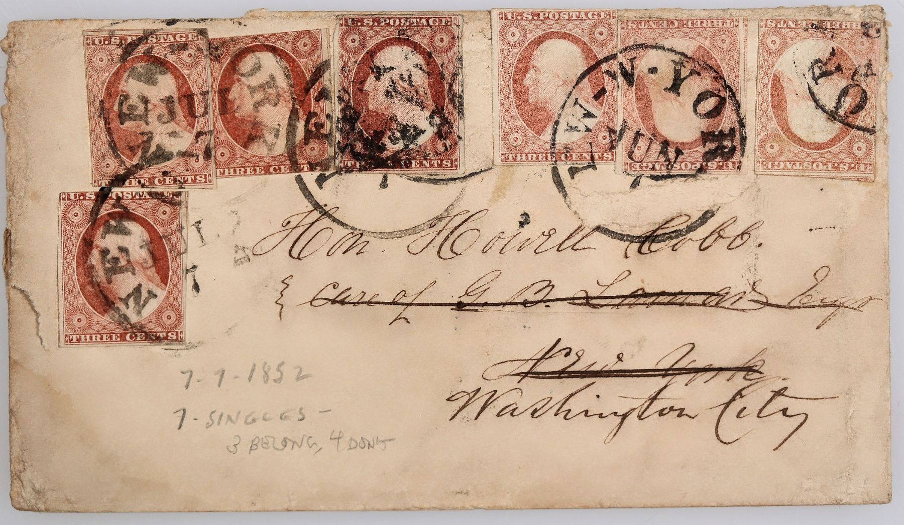 Unusual 1852 cover with 7x 3 cent stamps. 3 on right belong, 4 on left do not belong. Cover has been altered, but when? New York postmarks, red wax seal on back.