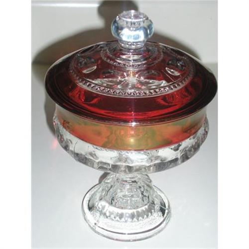 This candy dish is in excellent condition. Has the thumbprint design with Ruby trim. It has 3 seams in the bottom piece and one seam running across the top. There are no cracks or chips. Just a beautiful piece.