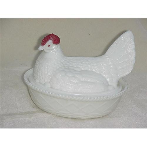 An unmarked covered hen dish, 7 1/2" long, hen with red comb sits atop a basket weave dish, Opalescent milk glass. Condition is very good , no chips or cracks.