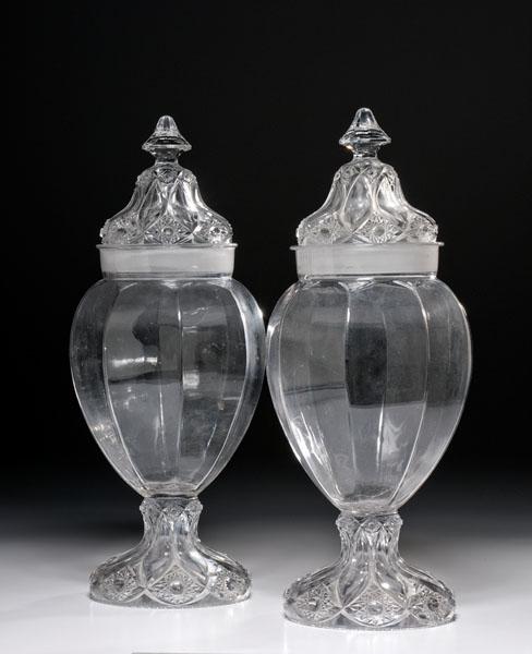 American, late 19th- early 20th century. A pair of ovoid paneled sweetmeat jars with imitation cut glass pressed lids, raised on round feet; 20" high.