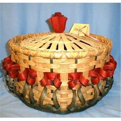This covered tulip basket is designed by Sarah. It is 11 inches high and is in excellent condition. This basket has tulips around the outside and a tulip perches atop the lid as a handle. Done in shades of red and green it is a great summer touch to your decorating. To order this basket please contact Mindi by e-mail at