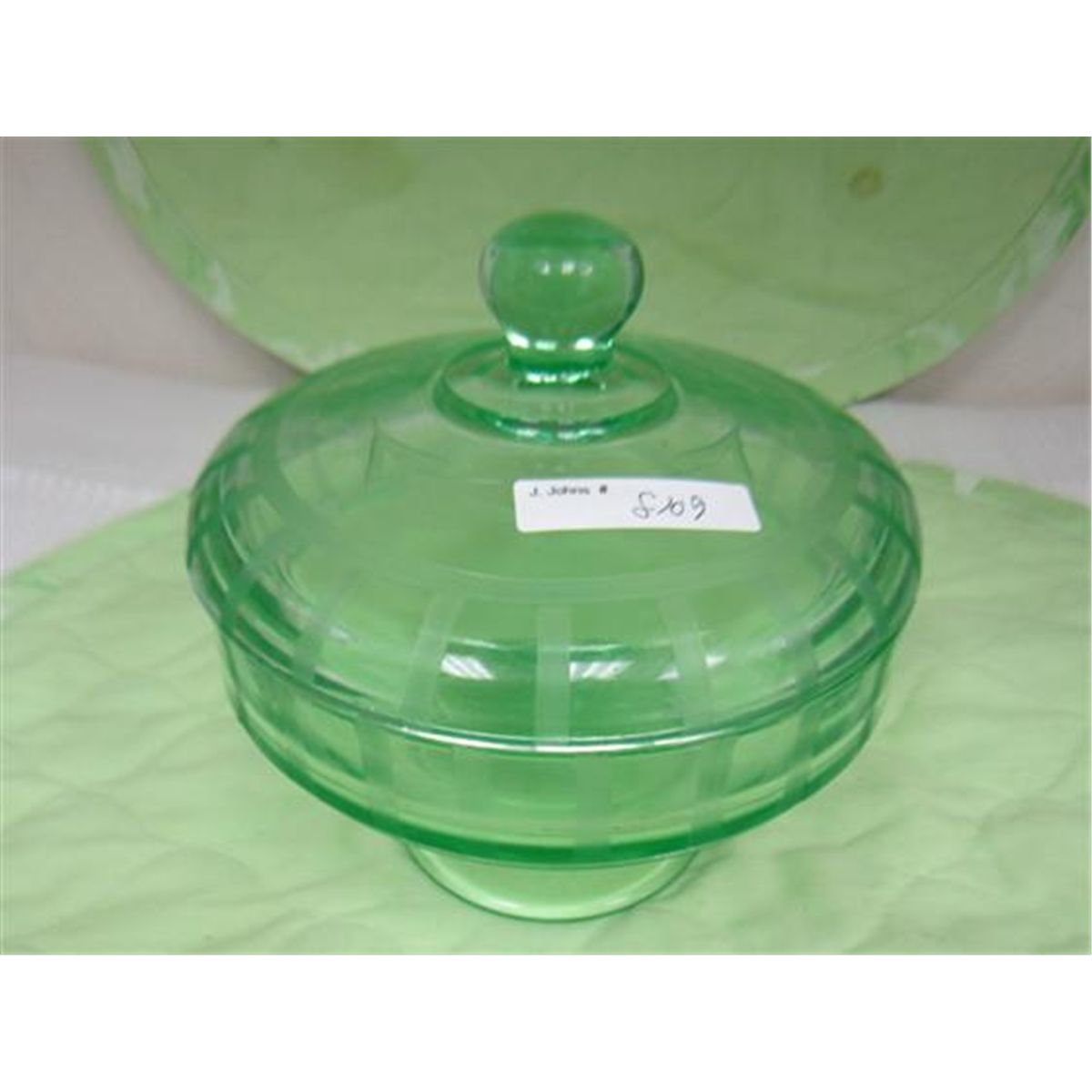 Covered pedestal candy dish etched flowers on lid depression glass in green - 7 tall
