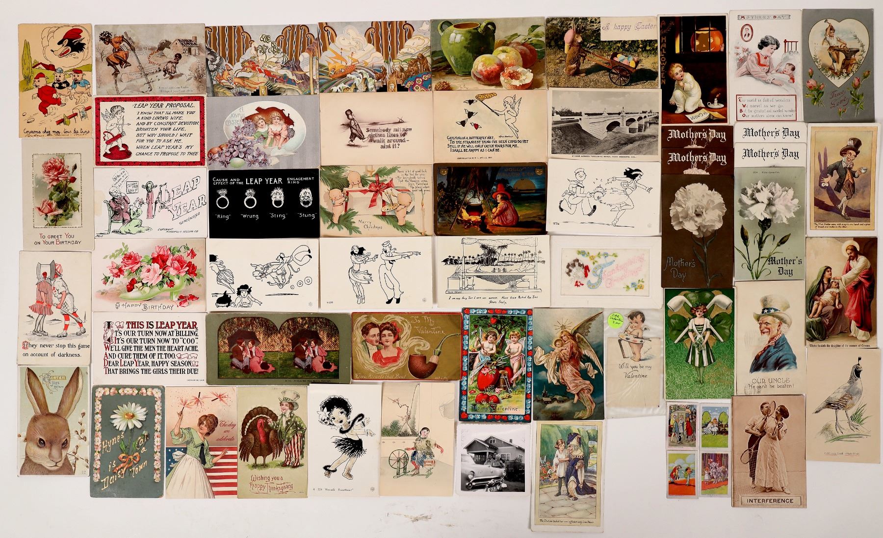 Lot of 53. One pre-split souvenir card. One Stereo-optican card of lovers. Three large stamps of Alice in Wonderland (??). One personal photo. Post cards cover Valentines, Easter Thanksgiving, well almost every holiday. Postmarks: Brentwood Ca., Swan Iowa, Oakland Ca.,Erie PA., Renfrow Ok., Cower Mont., San Fran-1915 ExpoAuburn N.Y., Attica Ind. One card has 1 cent Washington stamp with no writing and no cancellation. 1908-35 Ken Prag Collection
