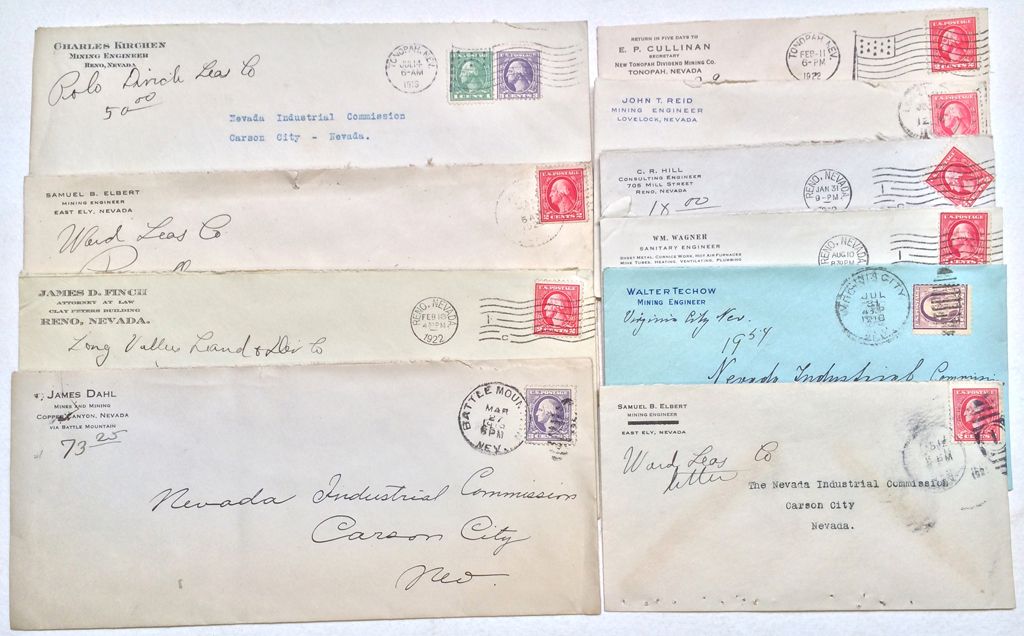 Lot of 8 includes Dahl of Copper Canyon via Battle Mountain, Kirchen of Reno, Elbert of East Ely, Techow of Virginia City, Wagner of Reno, Hill of Reno, Reid of Lovelock, Finch of Reno, and Cullinan of Tonopah. Cullinan demonstrated how one miner could carry two unconscious men out of a mine during the University of Nevada Mine Safety Day in 1914. It would become known as the 'Nevada One-Man Carry!'