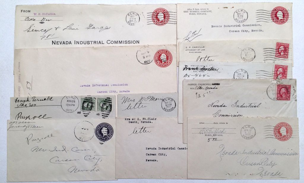Lot of 11. Names include George Russell and EP Carville - Nevada Governors. Also Mrs. M. K. St. Clair with a Deeth postmark.